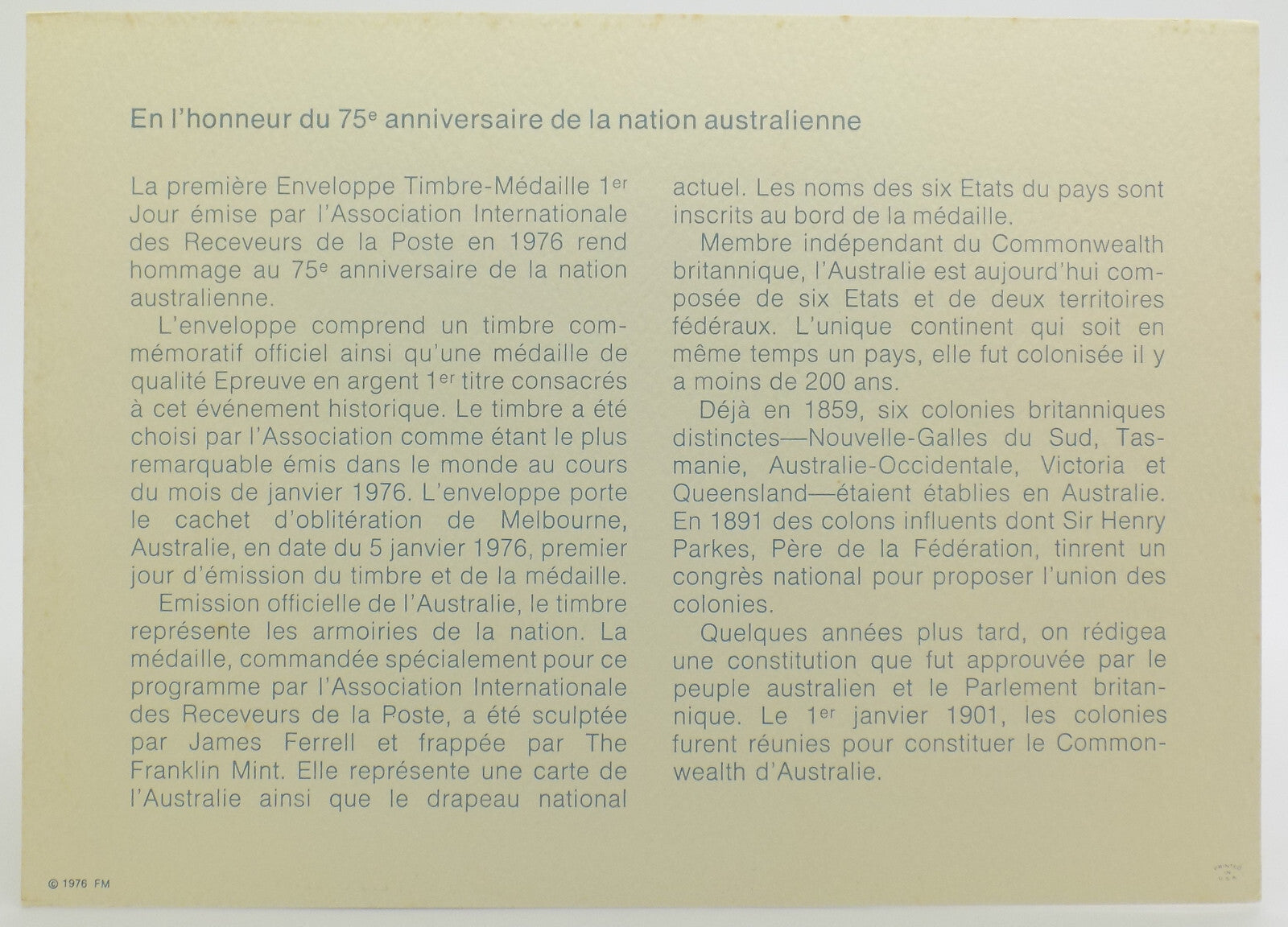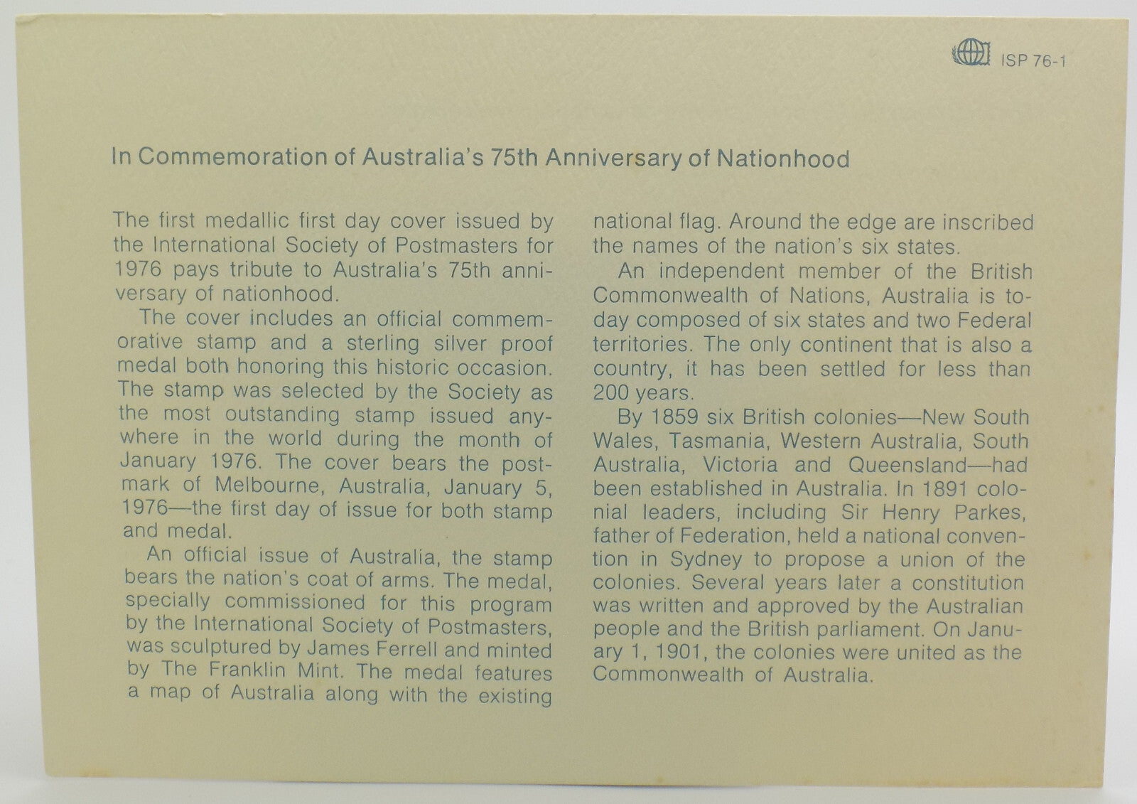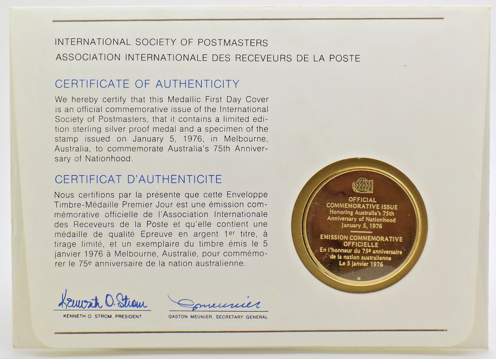 This medal is part of the official series issued by the International Society of Postmasters, and it comes in its original First Day Cover with an official postmarked Australian stamp, canceled in Melbourne on January 5, 1976 – the official date of issue.