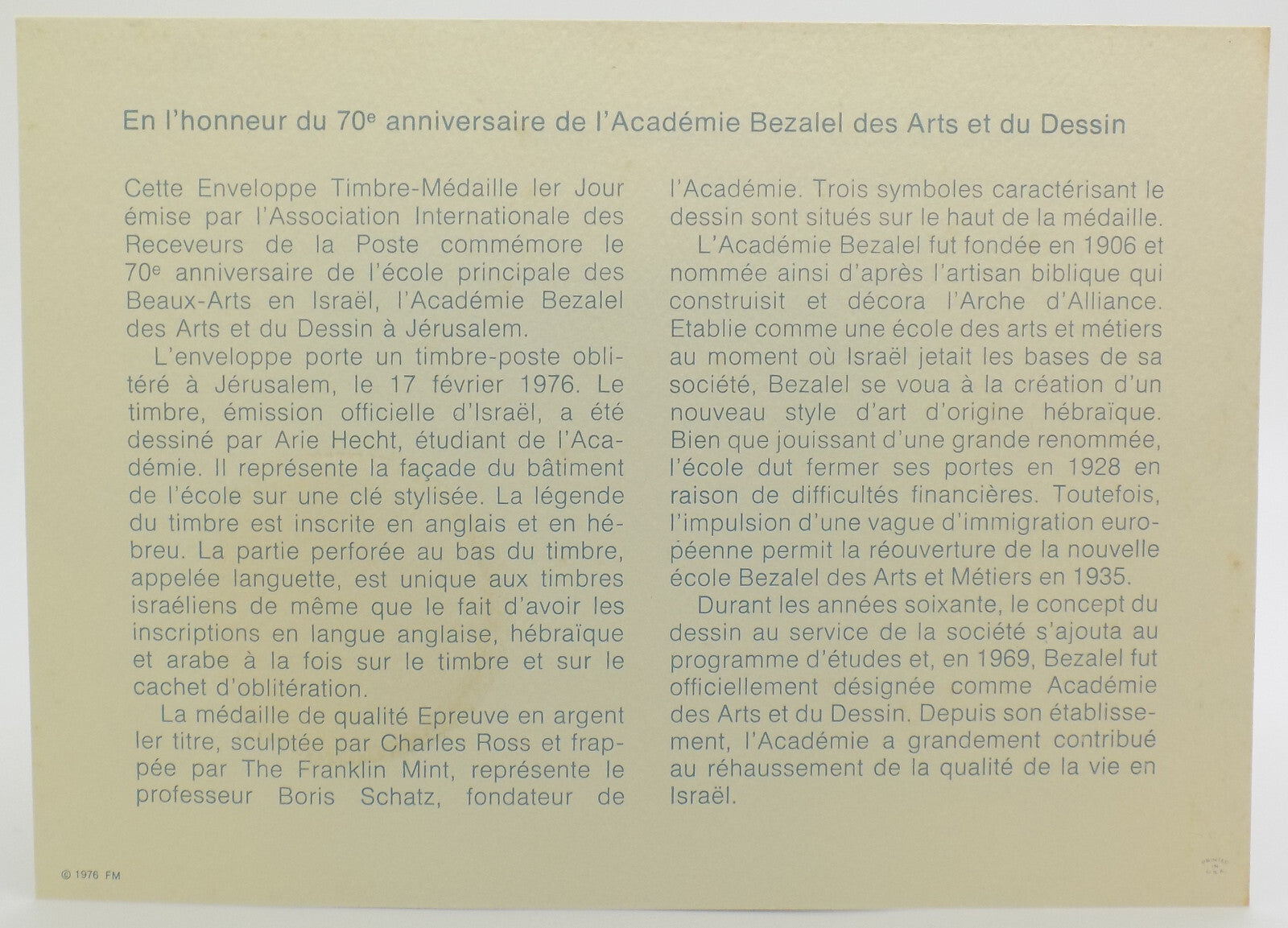This listing is for the exact item shown in the photos – a limited edition 1976 sterling silver proof medal commemorating the 70th Anniversary of the Bezalel Academy of Arts and Design in Jerusalem, Israel. The medal is part of a prestigious international series issued by the International Society of Postmasters, and was minted by The Franklin Mint (USA).