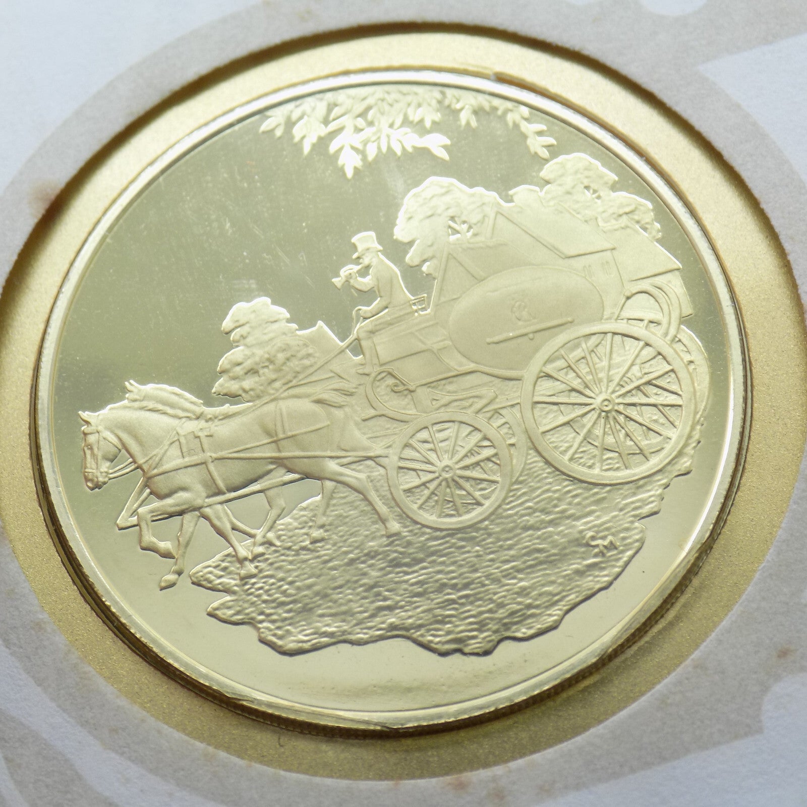 Obverse: Intricately detailed image of a 19th-century Danish mail coach ("ball-post") in motion, based on the historic postal service scene.