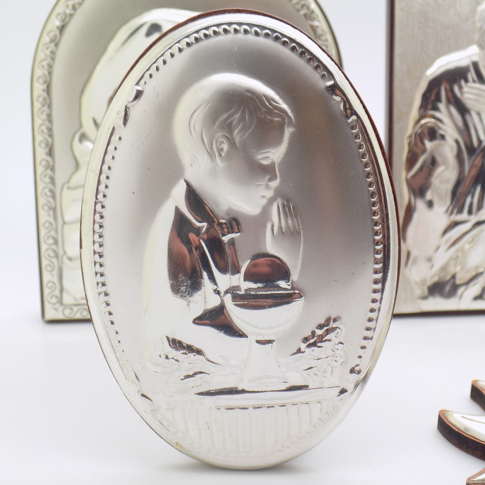 This collection of sacred icons, crafted in Italy during the 1970s/1980s, features a mix of silver-plated and silver lamina (sheet) pieces.