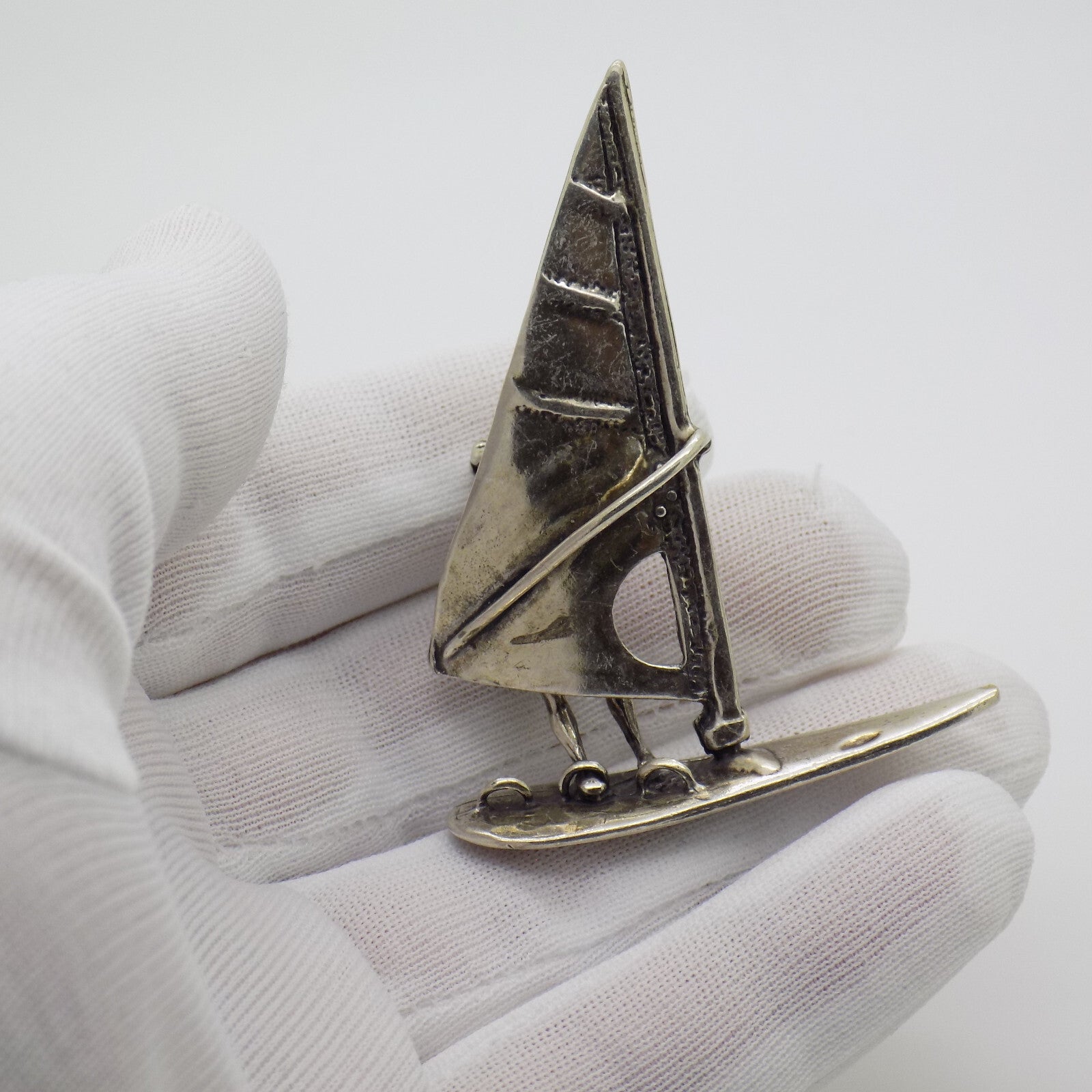 A finely detailed windsurfer miniature handcrafted in Bari, Apulia, Italy during the 1980s or 1990s. Hallmarked 800 for Continental Silver (800/000), together with the Italian Silversmith Code, this piece represents the artistry and craftsmanship of southern Italian silversmiths.