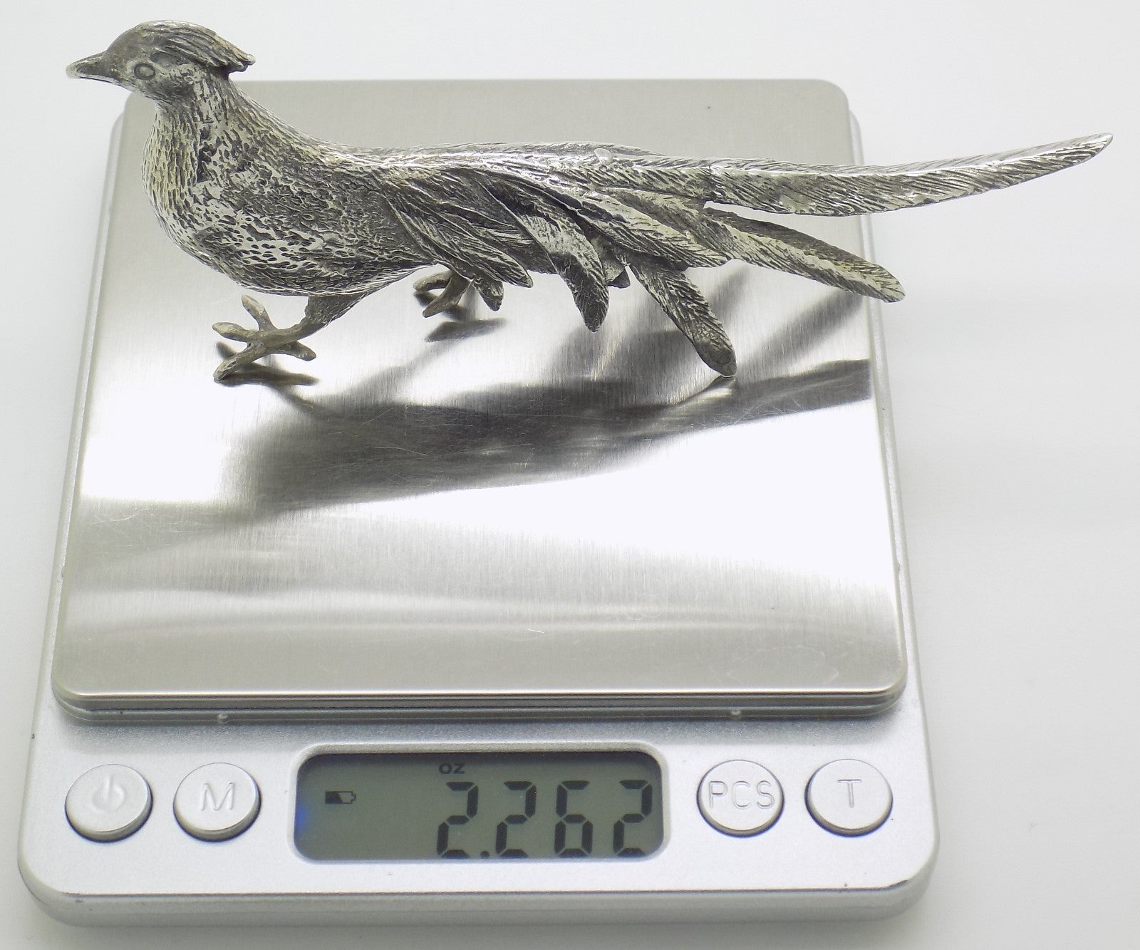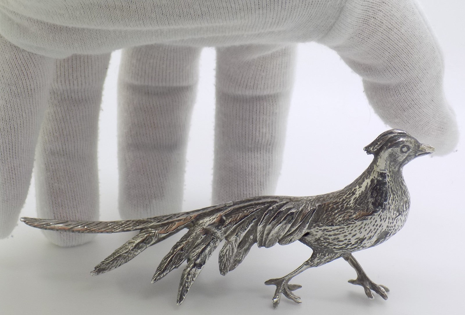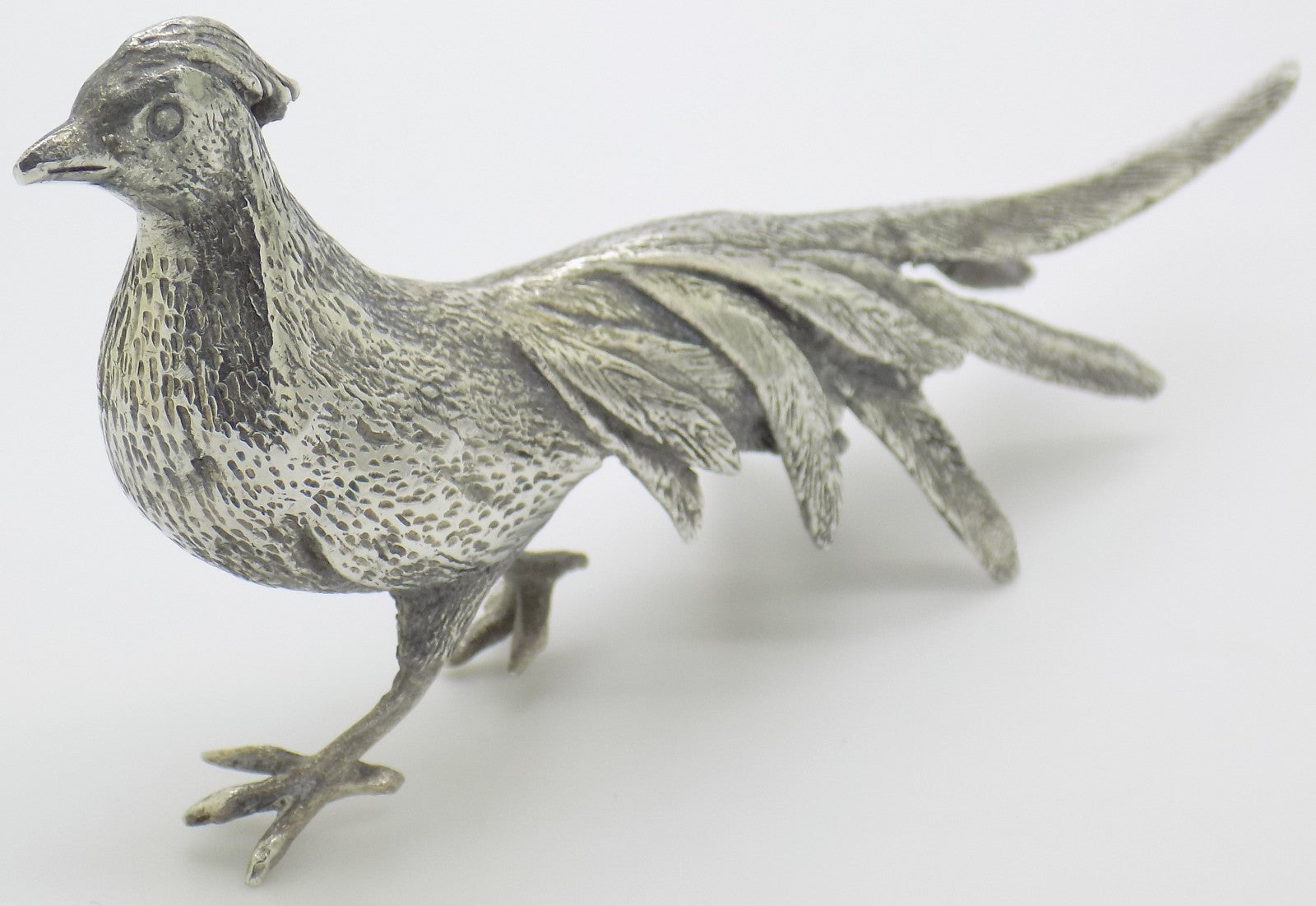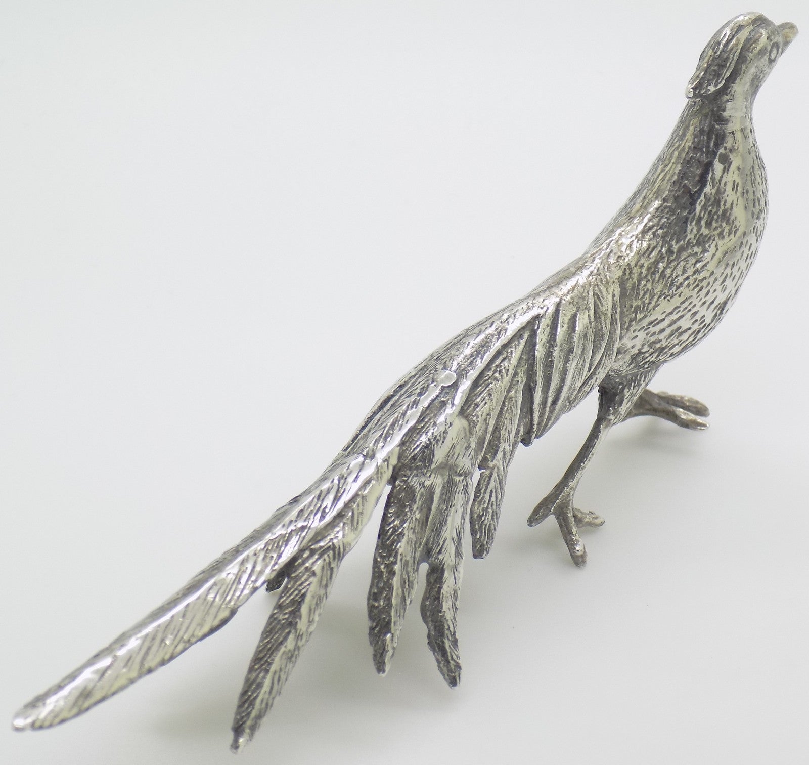 A beautifully crafted large pheasant figurine, handmade in Italy during the 1960s or 1970s. This piece shows traces of the 800 hallmark (Continental Silver (800/000)), a detail taken into account in its pricing. The intricate work captures the elegance and natural stance of the pheasant, reflecting mid-century Italian silversmithing skill.
