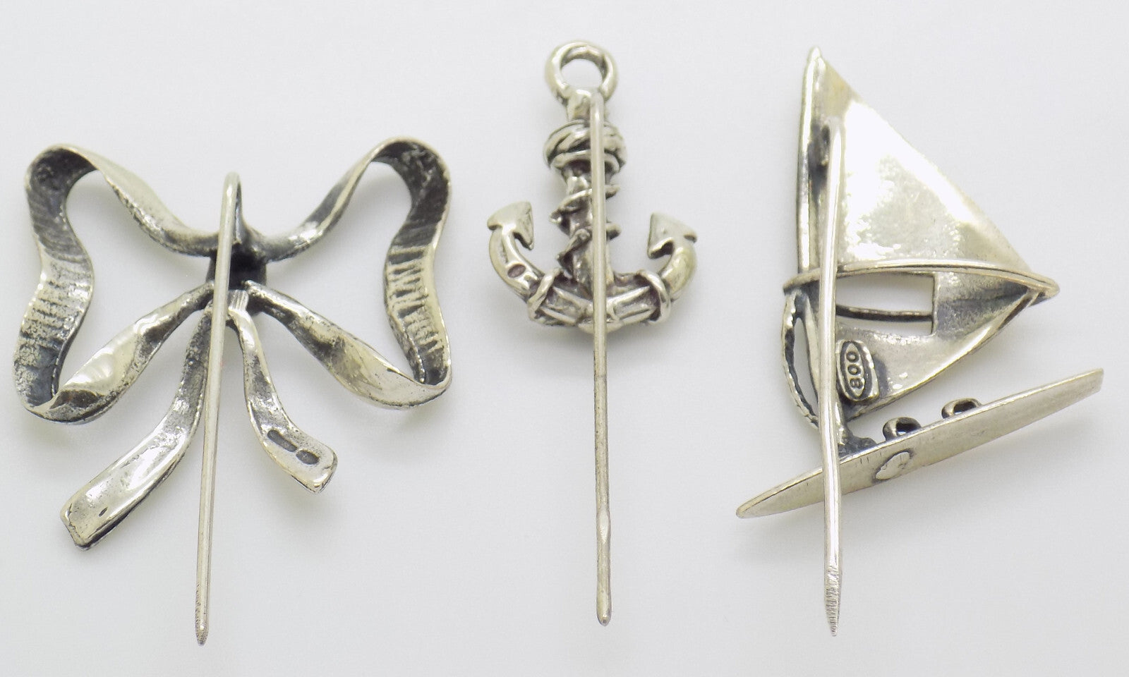Vintage Italian Handmade Genuine Silver 3 x Brooches Anchor Ribbon and Windsurf