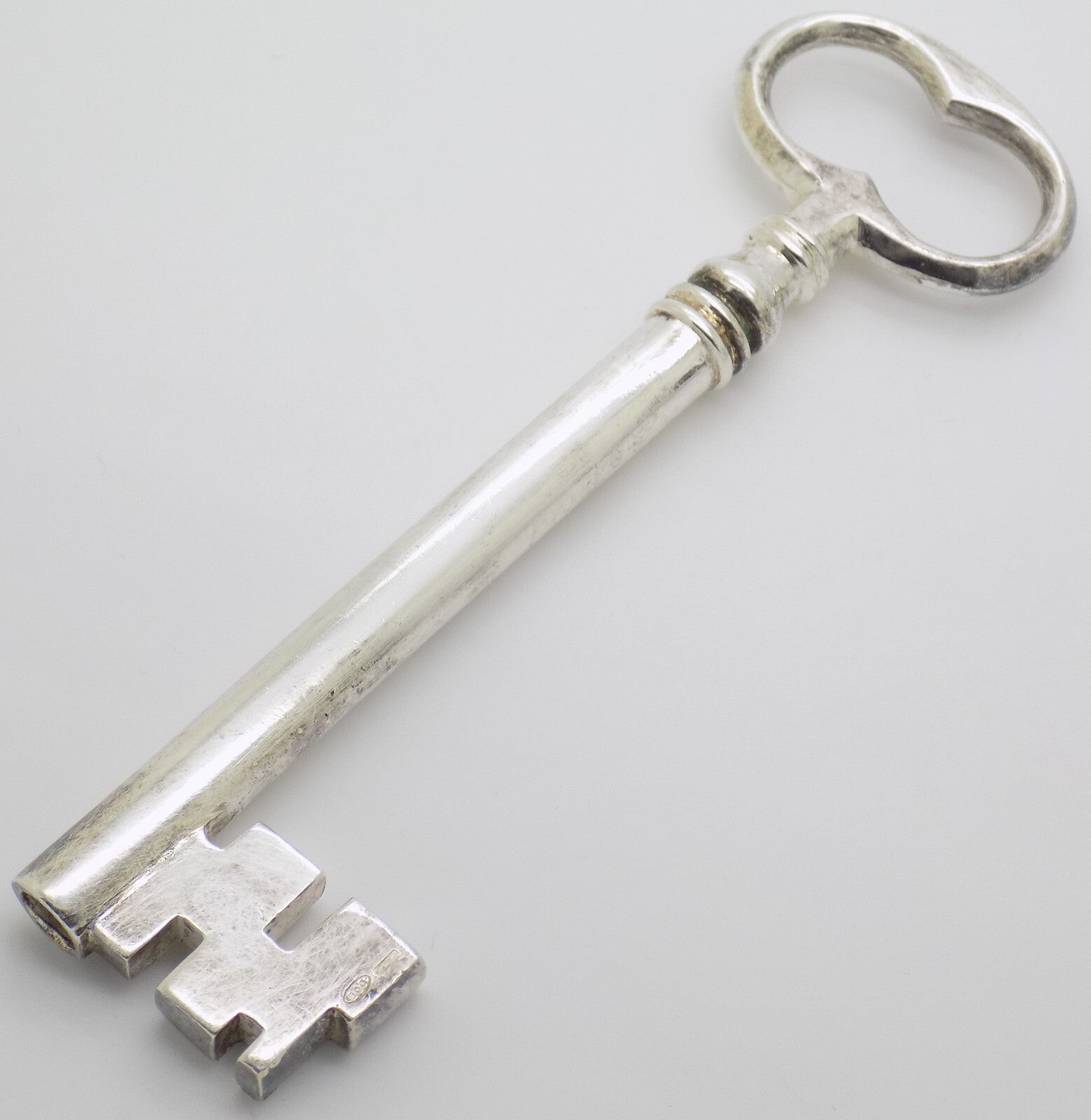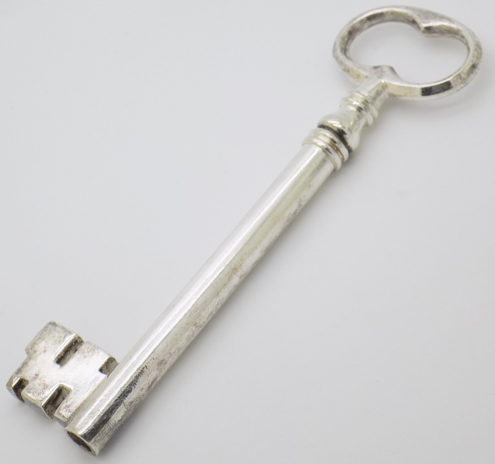 Substantial vintage silver gate key, handmade in Alessandria (Italy) during the 1970s/1980s. Crafted in Continental Silver 800/000, hallmarked 800 and bearing the Italian Silversmith Code. This is a larger and heavier piece compared to most decorative silver keys, offering a striking presence in any collection.