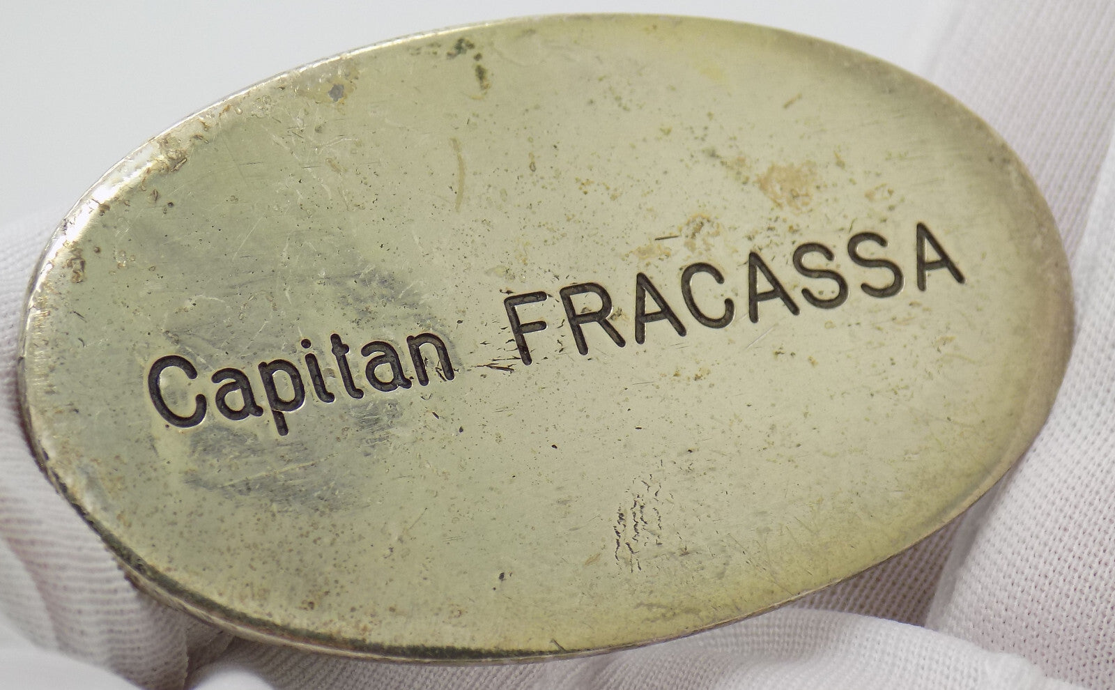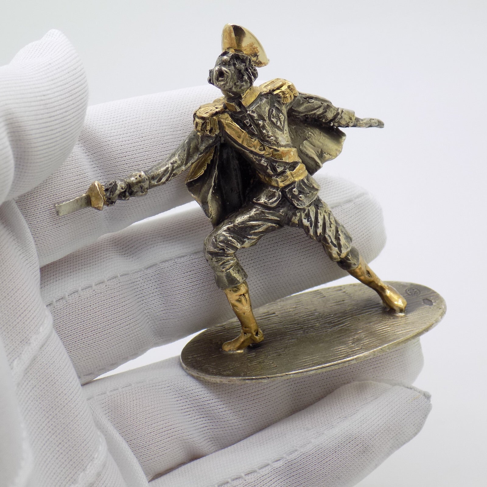 This magnificent figurine, portraying Captain Fracassa from the renowned Commedia dell'Arte, captures the essence of Italian theatrical tradition. Weighing 2.449 ounces (69.43 grams; 2.23 troy ounces), this piece is a testament to the skillful artistry emanating from Milan (Milano, MI, Lombardia, Italy). A rare find, this figurine brings to life the timeless allure of Italian silver craftsmanship.