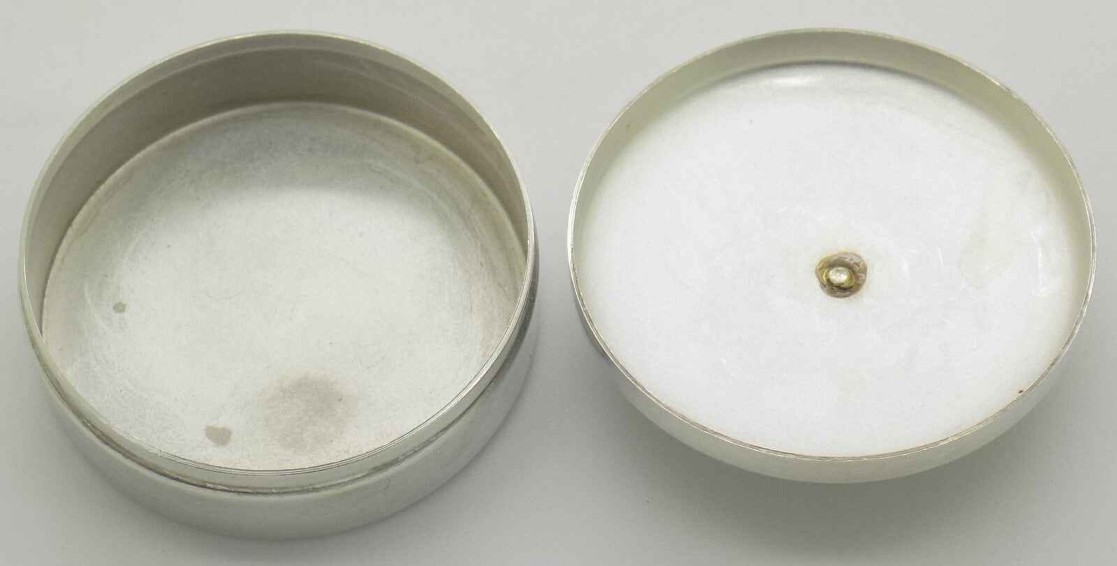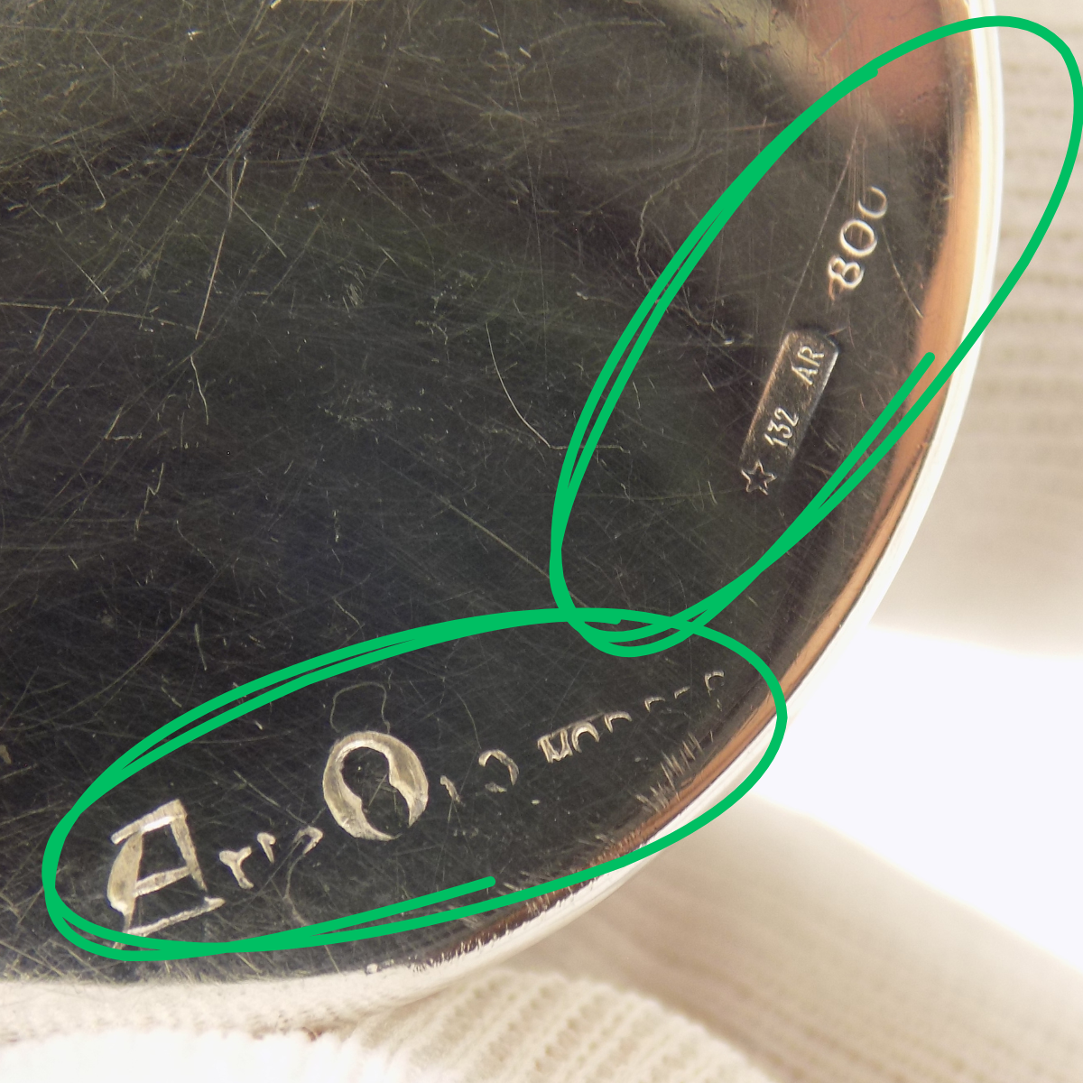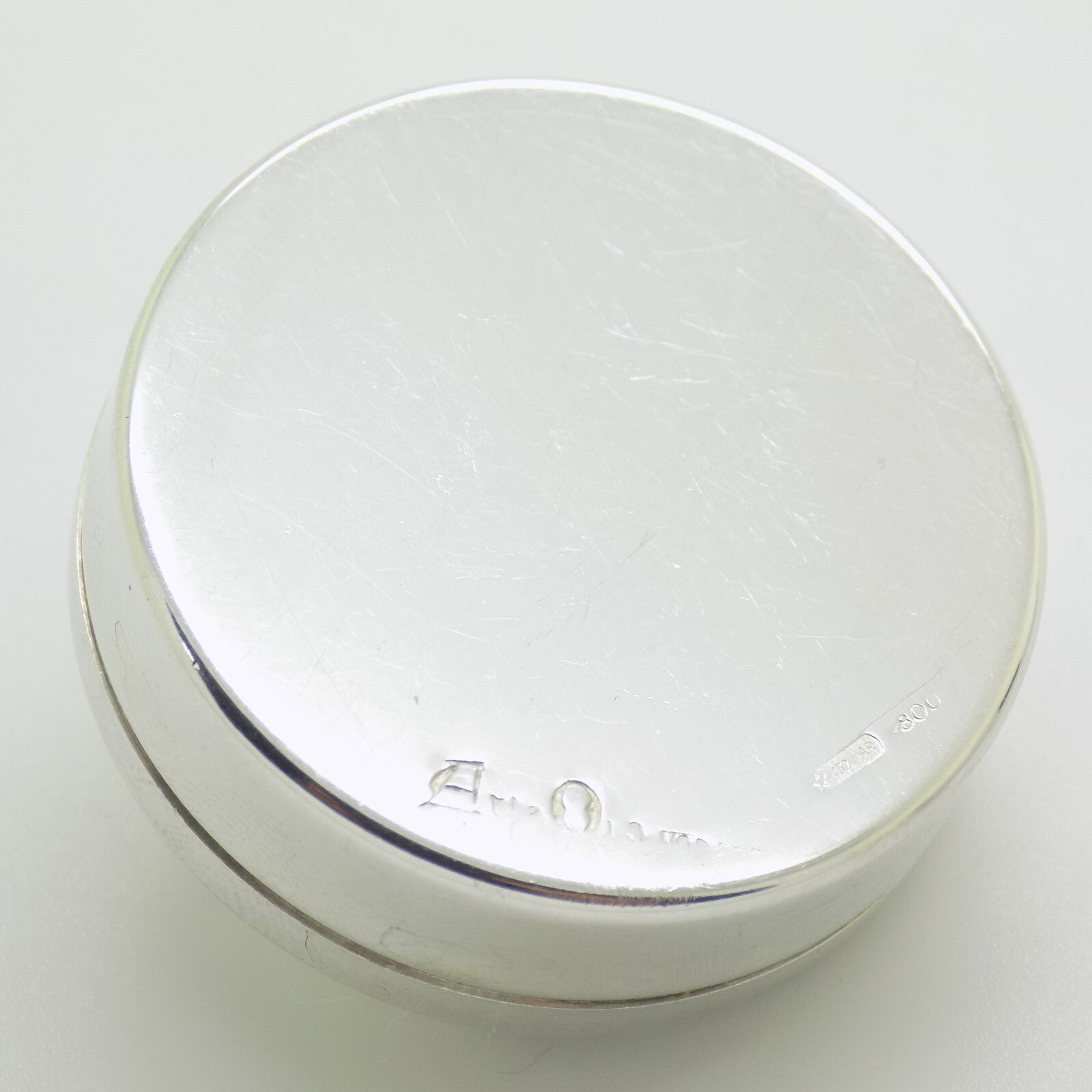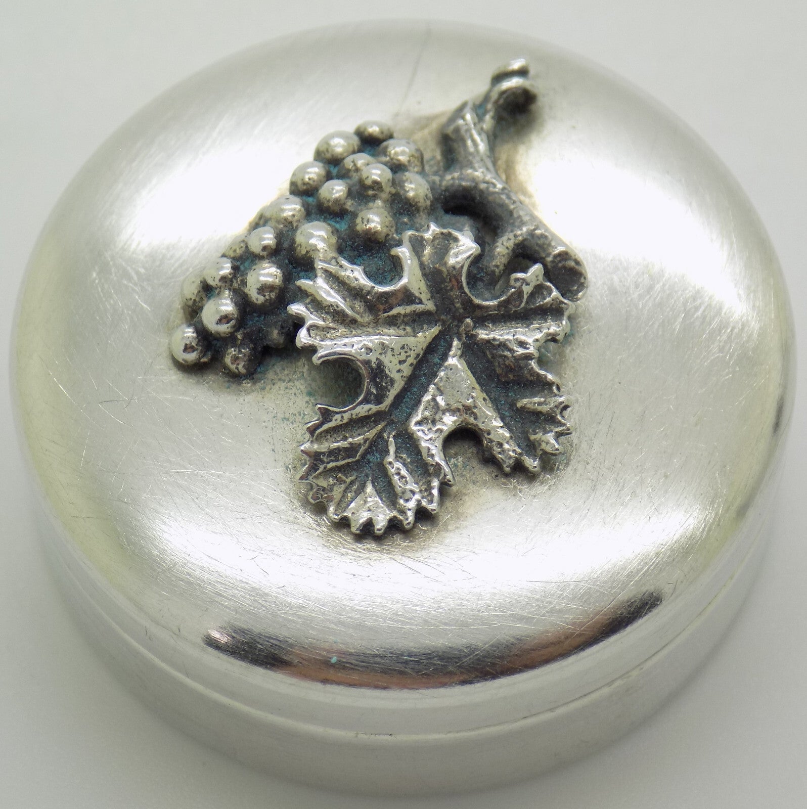 Estimated period 1970s/1980s, this bunch of grapes-decorated pill, snuff, or trinket box exemplifies the fine craftsmanship of Italian silversmiths. Hallmarked 800, indicating Continental Silver (800/000), and featuring traces of the Brand Logo/Name and the Italian Silversmith Code, this piece weighs 0.646 ounces (18.31 grams) or 0.59 troy ounces.