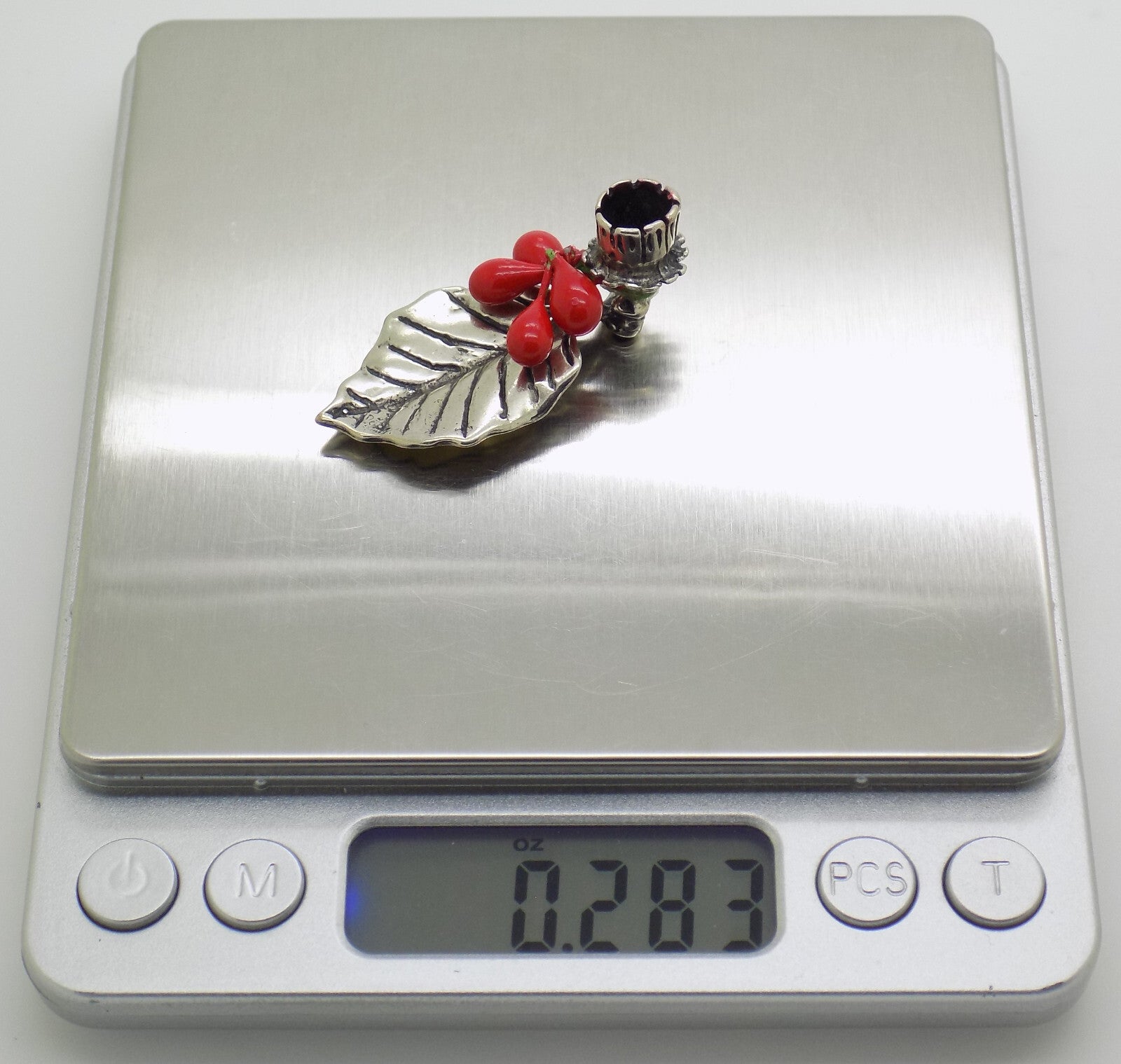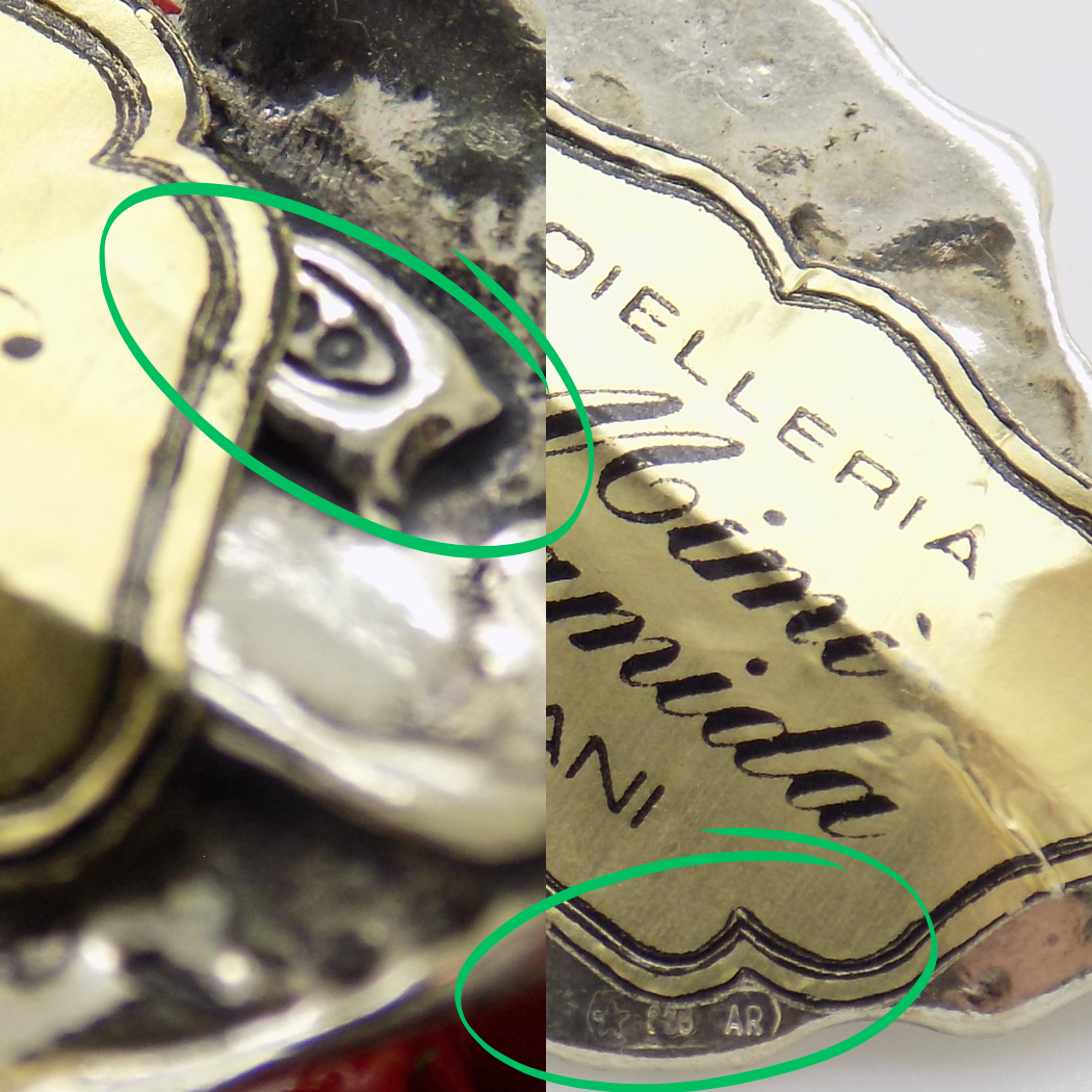 Made from Continental Silver (800/000), it is stamped 800, although the mark is partially covered by an original Italian jewelry shop sticker. The red enameled elements are decorative and not made of silver.