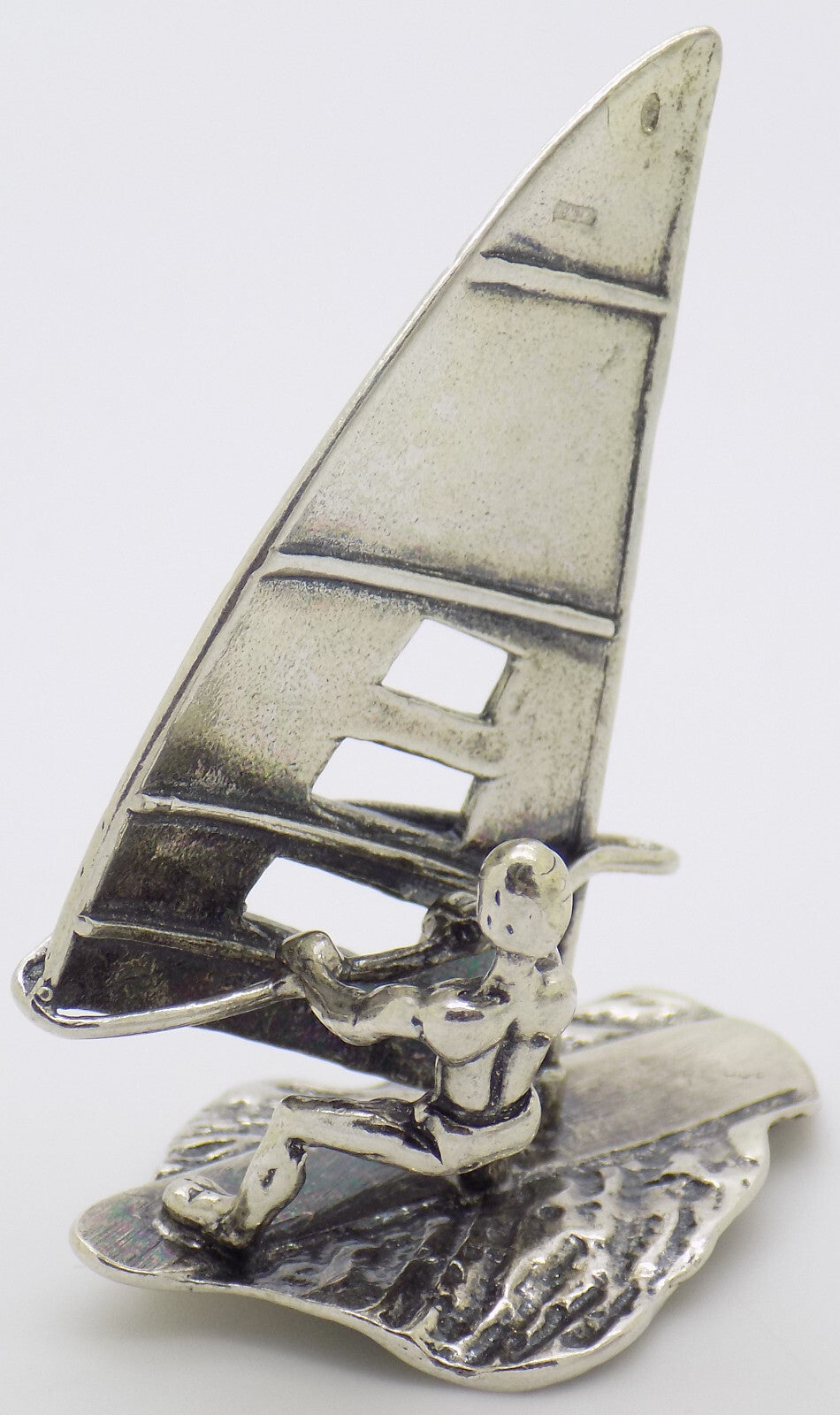 A vintage Italian silver miniature from the 1980s and 1990s, hallmarked 800 with the Italian Silversmith Code. This windsurf figurine is finely detailed, capturing the dynamic motion of the sport in miniature form.