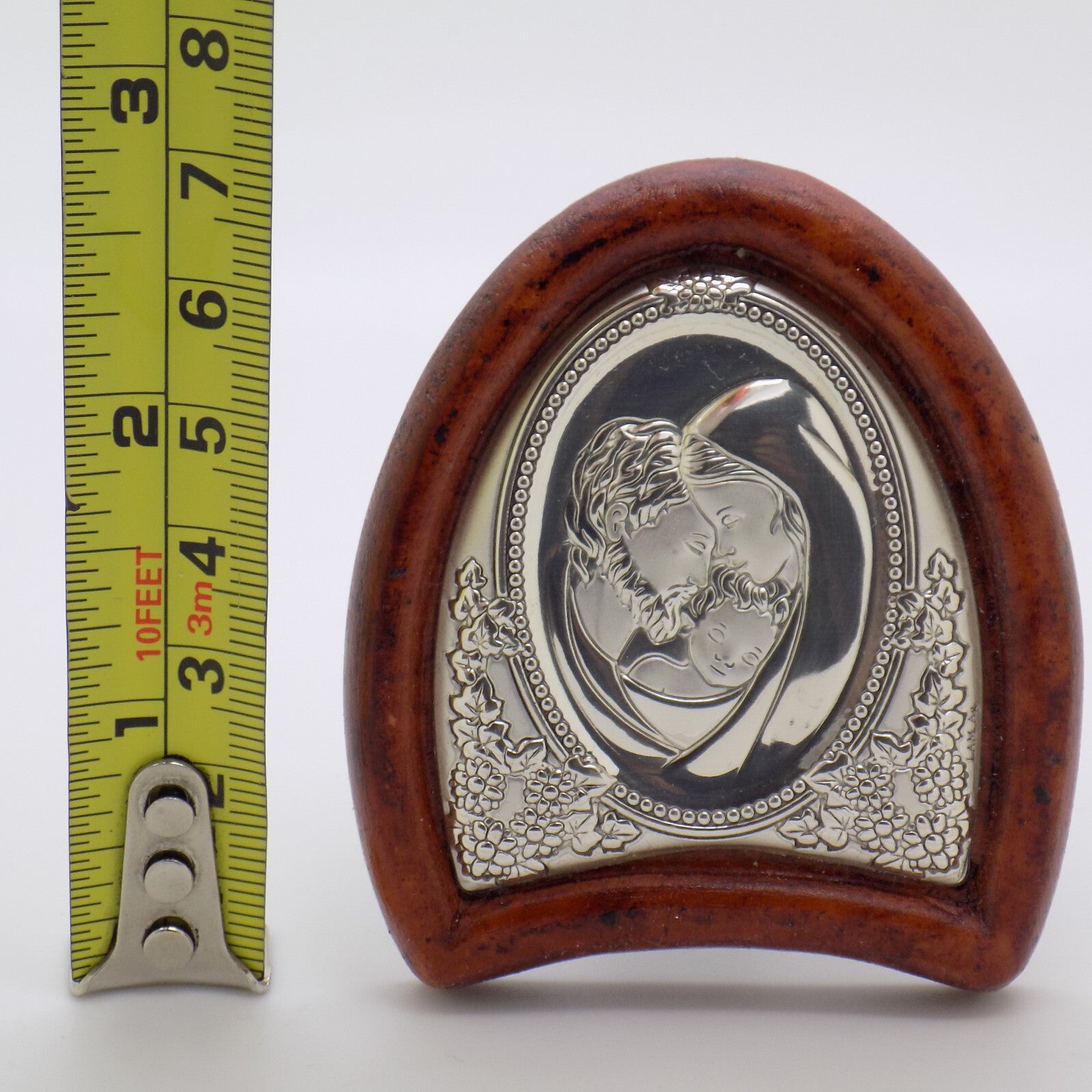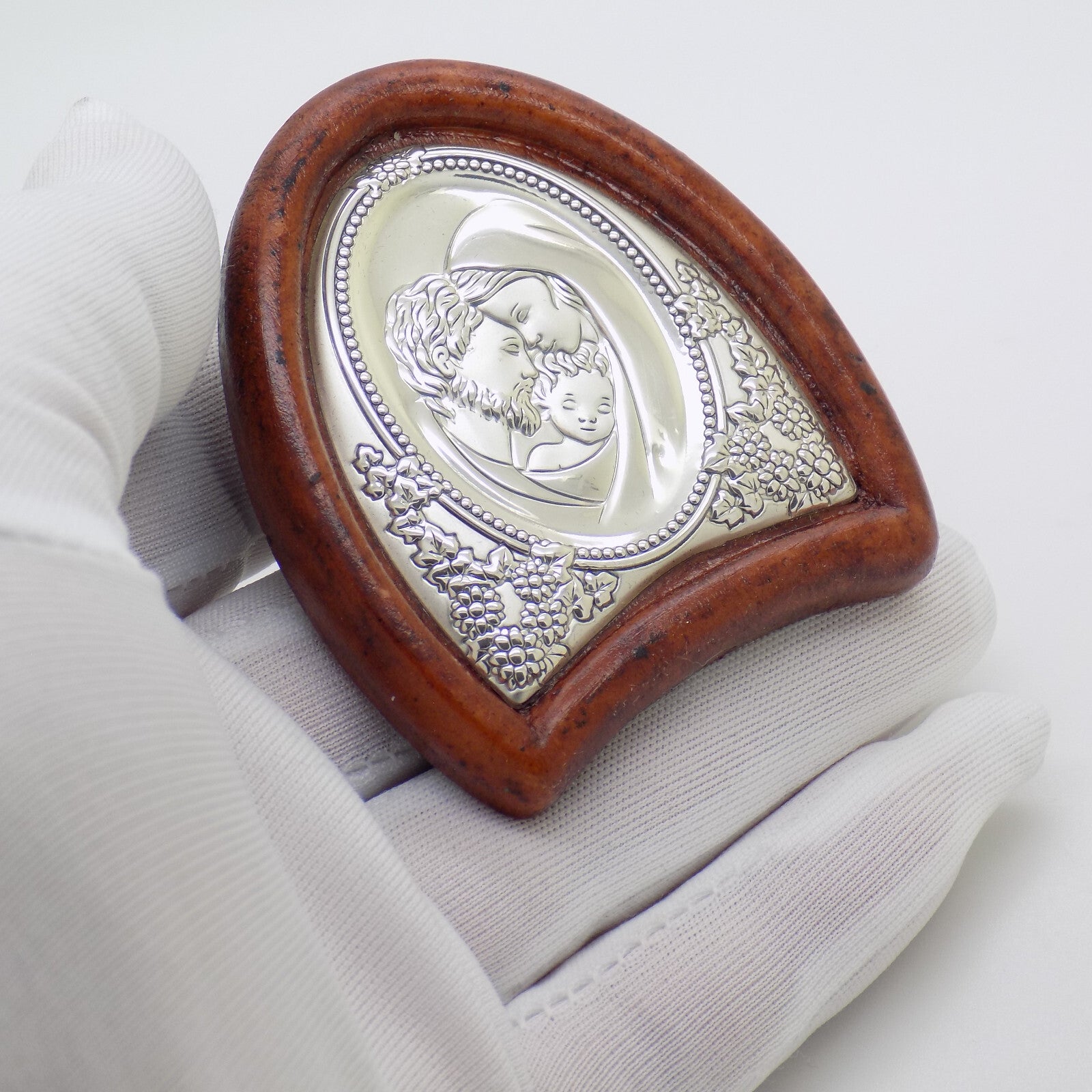 The silver lamina icon shows a tender scene with Joseph, Mary, and the infant Jesus, all with halos around their heads.