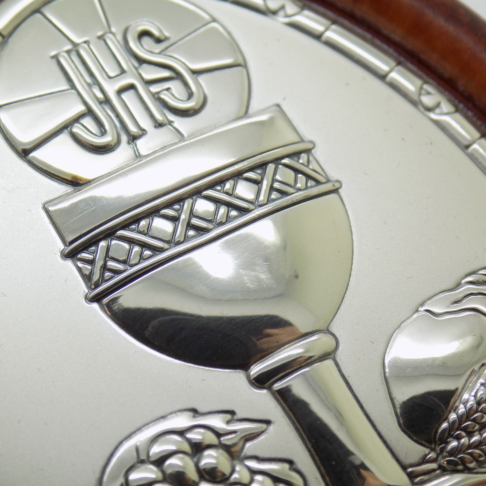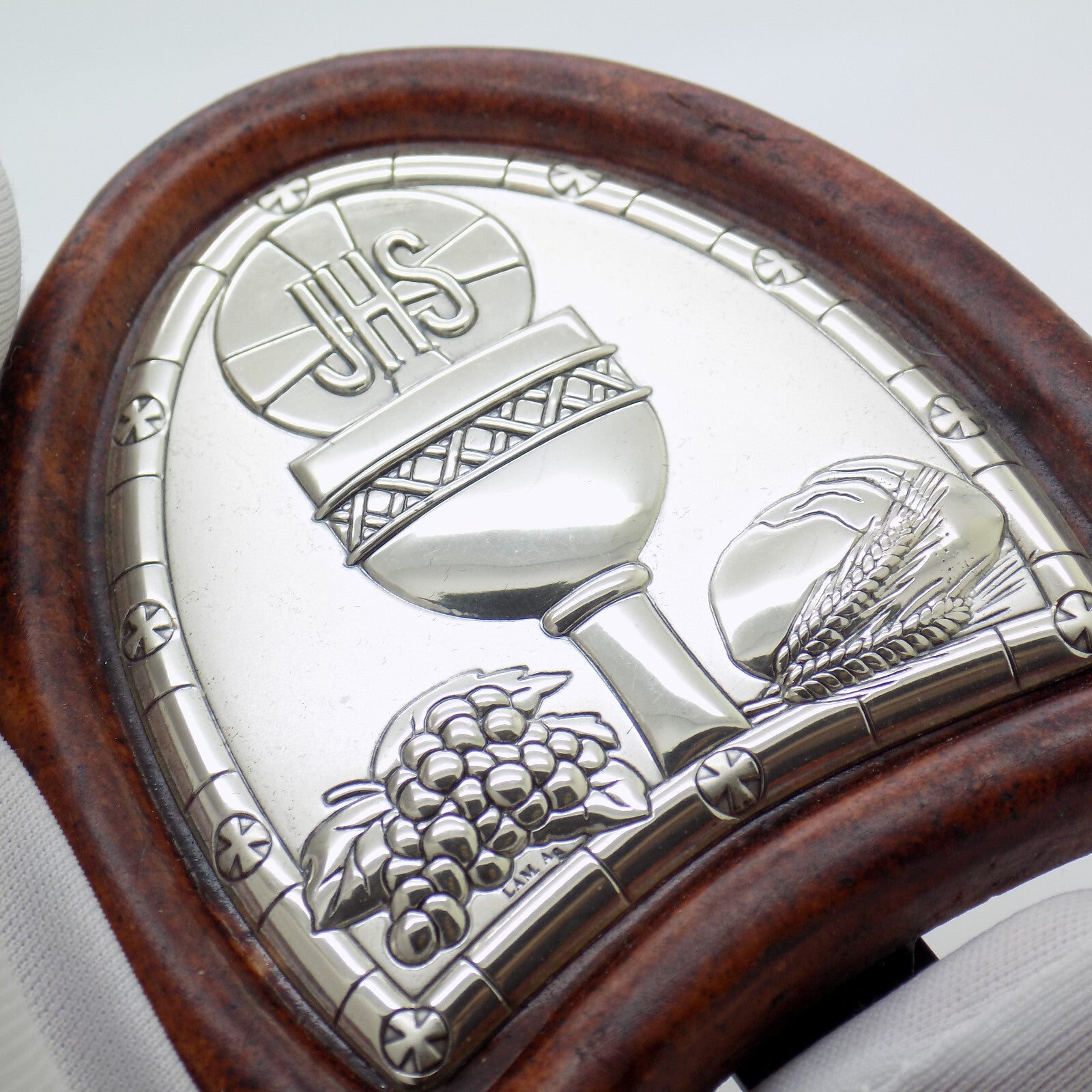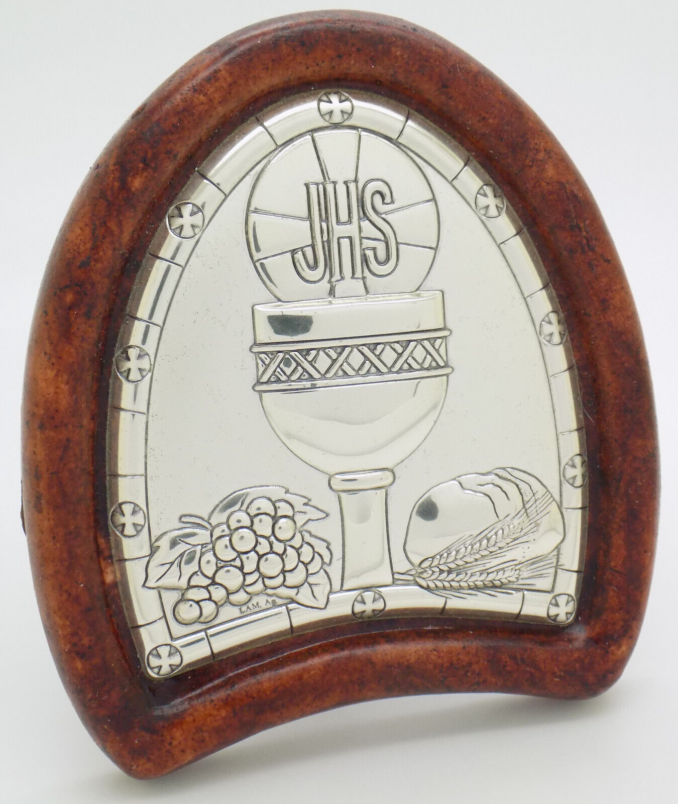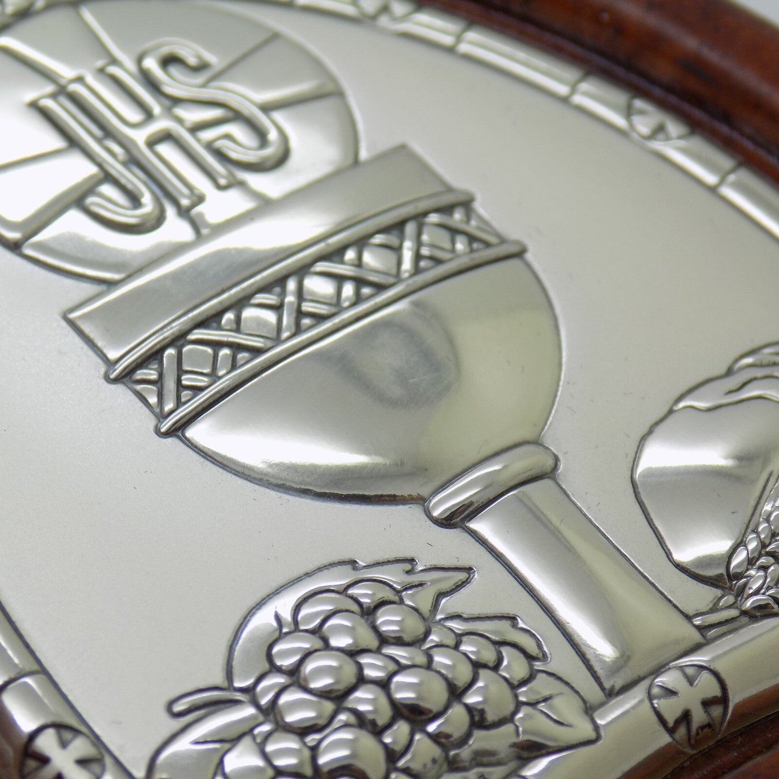 Below the chalice, there are representations of grapes and wheat, symbolizing the bread and wine of the Holy Communion.