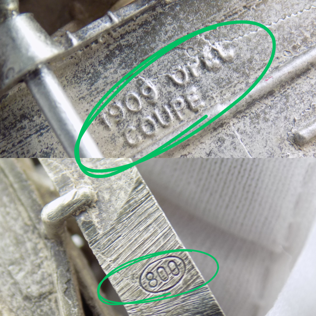 This silver figurine captures the essence of the Opel Coupe 1909, lovingly handcrafted in Italy during the 1960s or 1970s. Bearing the 800 mark for Continental Silver (800/000), it tells a story of a time when skilled Italian artisans transformed the legacy of classic automobiles into small treasures of metalwork.