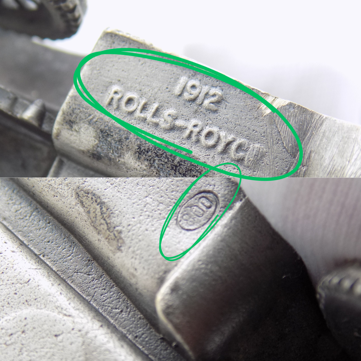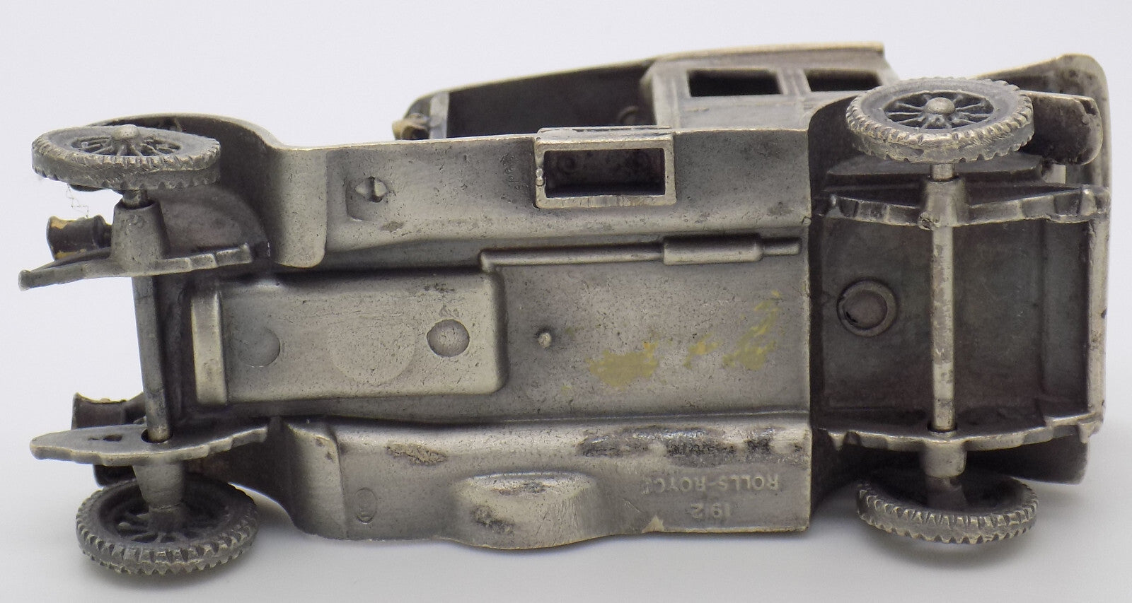 A vintage silver car figurine representing the classic 1912 Rolls-Royce model. Handmade in Italy and stamped 800, which stands for Continental Silver (800/000).