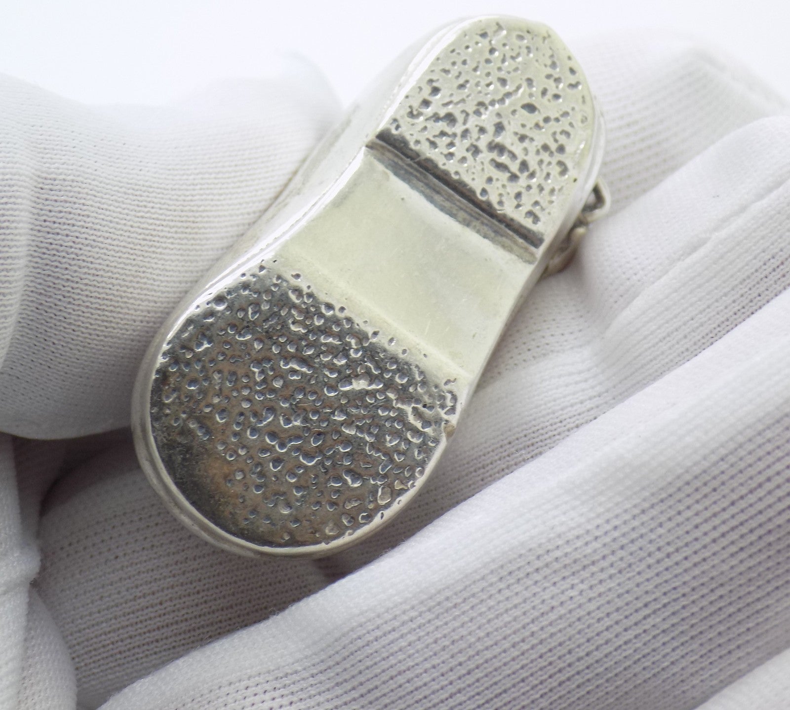 A delicate vintage miniature of a child’s shoe decorated with flowers, handmade in Italy during the 1980s/1990s. Crafted in Sterling Silver (925/000), it is hallmarked with 925 and ITALY, confirming its authenticity.