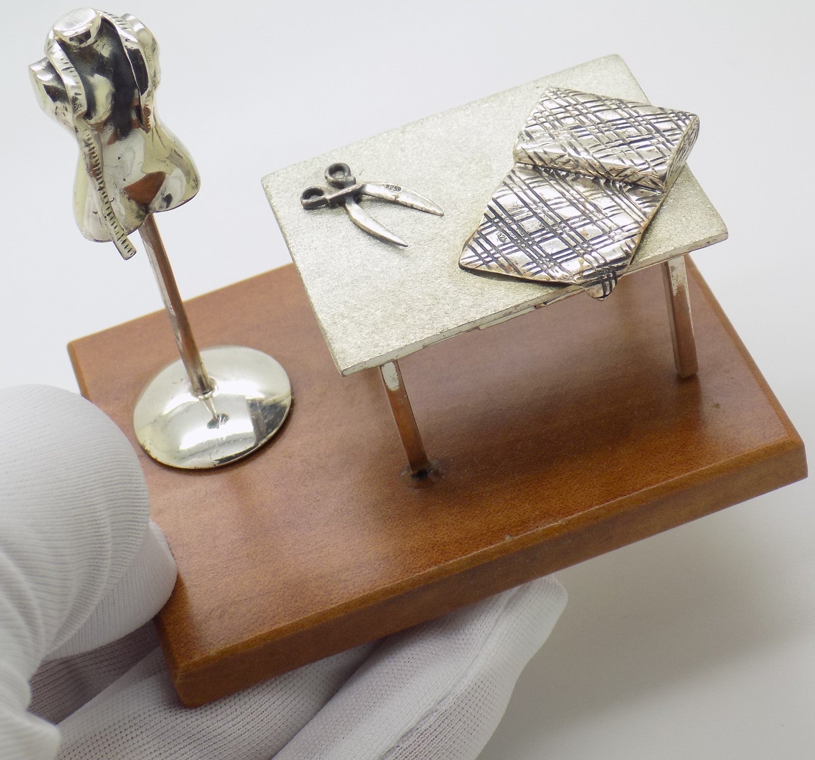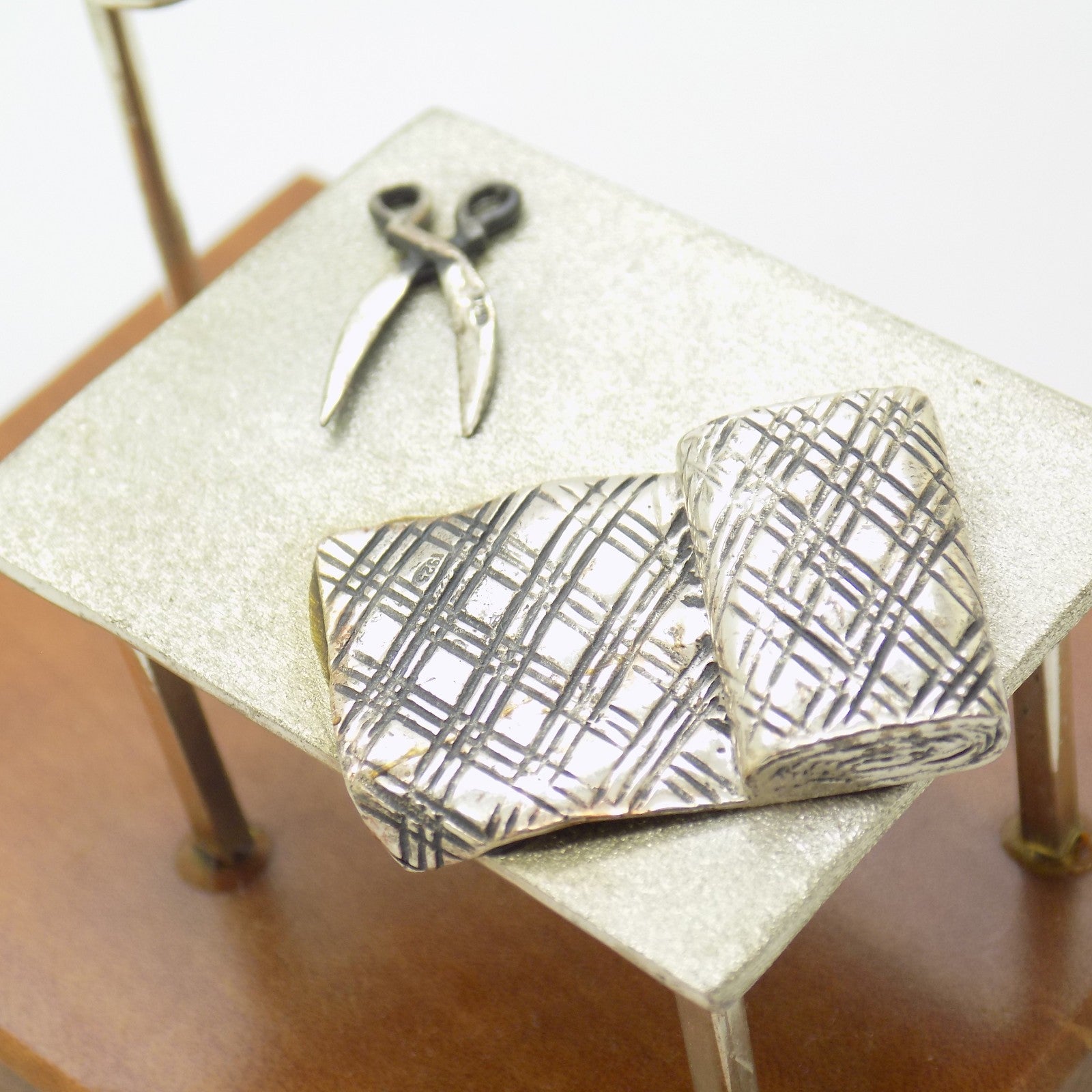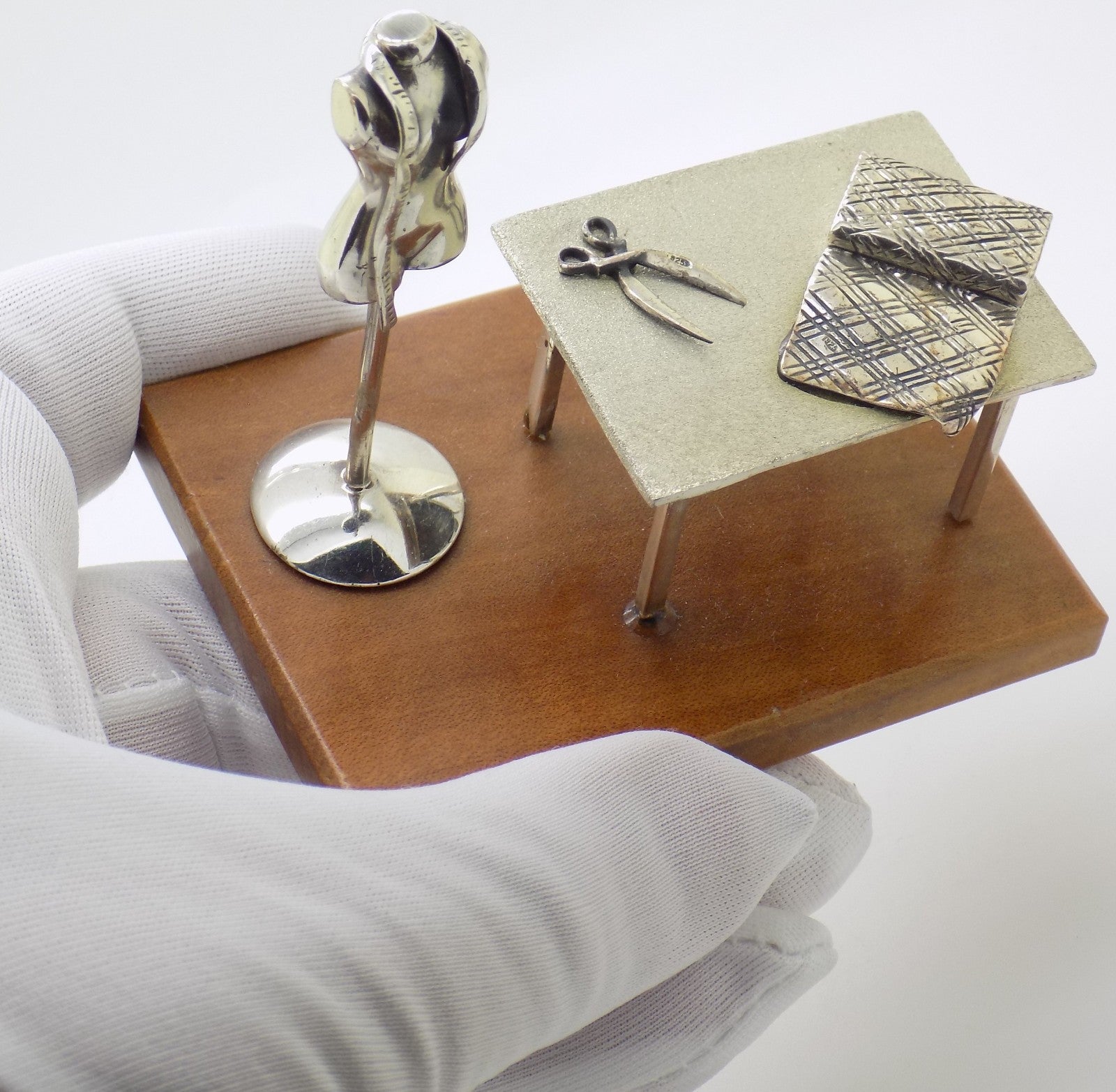 The ensemble includes a mannequin, scissors, measuring tape, and table, all crafted with remarkable attention to detail, showcasing the artistry of one of Arezzo’s respected silversmith workshops.