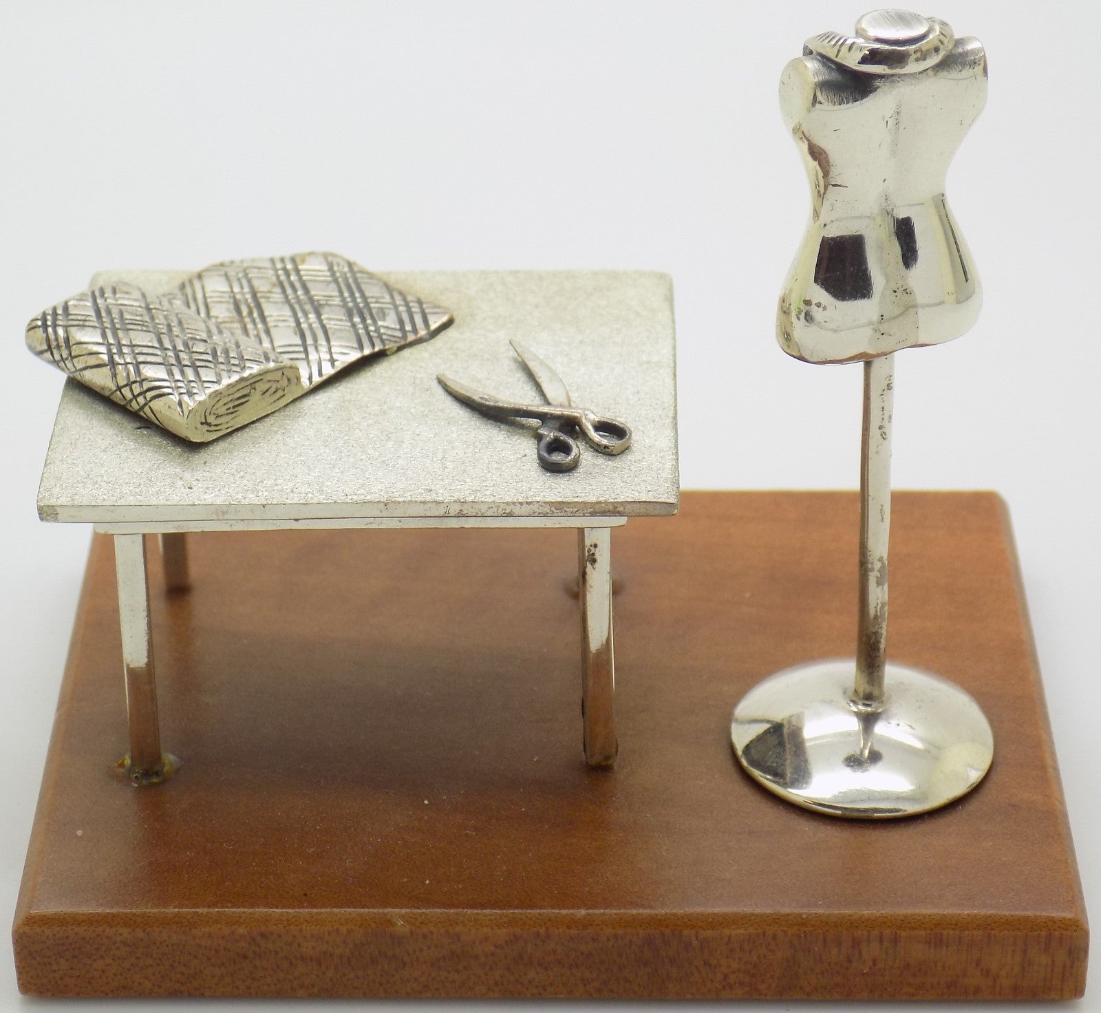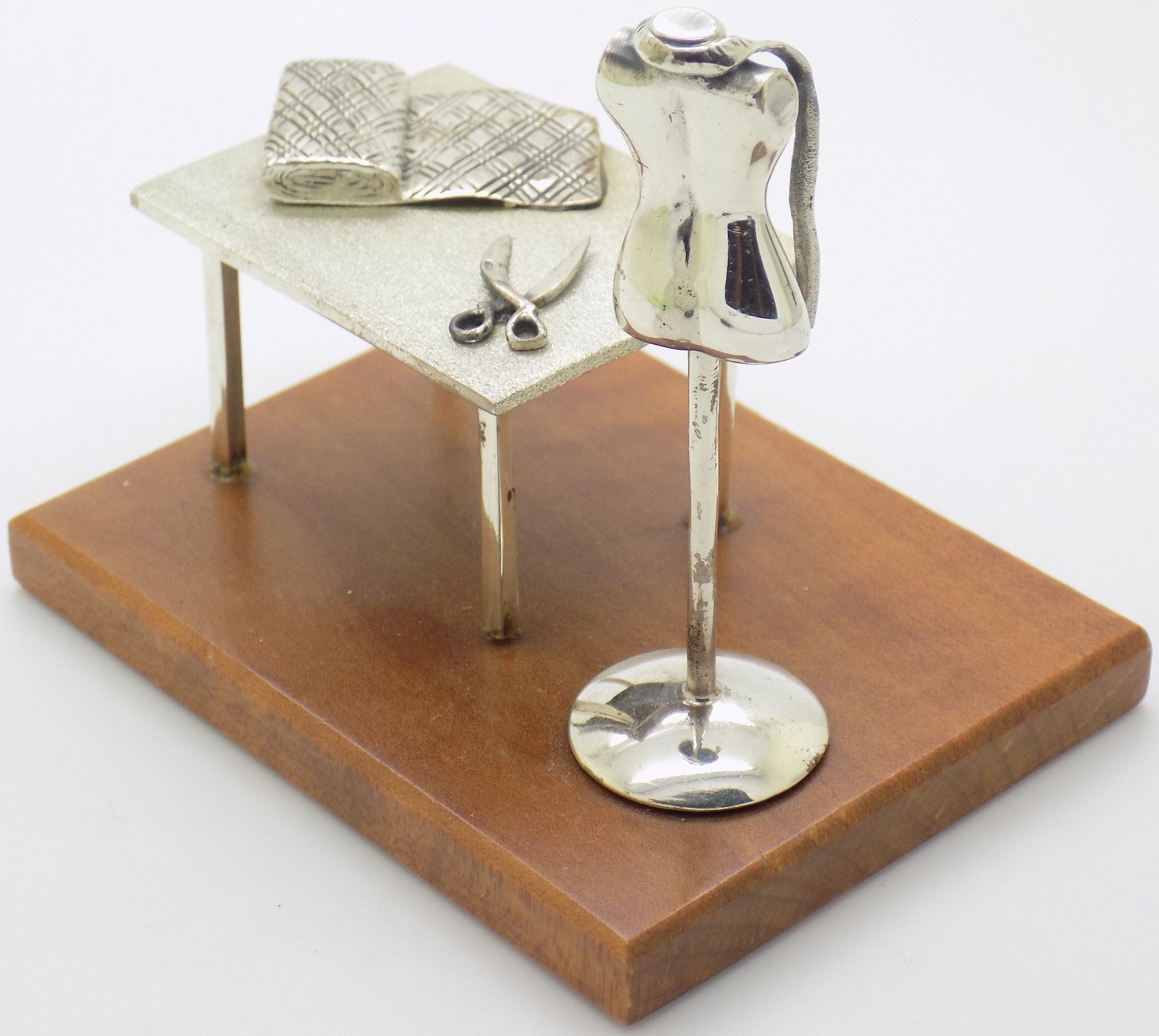 An impressive vintage figurine set representing a sewing studio, handmade in Arezzo (Tuscany, Italy) by Medusa-Oro during the 1980s/1990s. This collectible combines Sterling Silver (925/000) with wood, and is hallmarked 925 along with the Medusa-Oro brand logo/name and the Italian Silversmith Code.